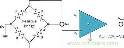 惠斯通電橋(或單臂電橋)電路應用非常廣泛,如今在現代運算放大器中,我們可以將惠斯通電橋電路與各種傳感器連接。不同于將一個未知阻值與已知阻值相比,惠斯通電橋在電路中有很多用法。惠斯通電橋電路就是在電源端和接地間兩個簡單的電阻串并聯,當電橋達到平衡時兩個并聯分路間產生零壓差。