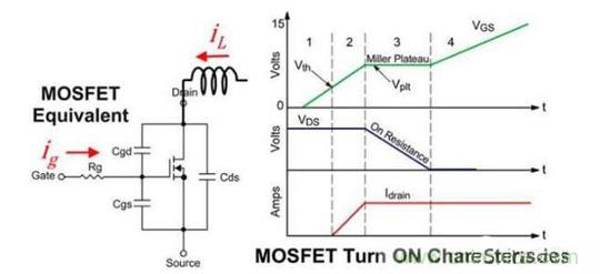 這里就用MOSFET代替BJT了,所以ids = ic,Vds=Vce,Coss也就是Cds代表輸出電容。簡單來說就是當MOS管一開始導通時輸出電容Coss還保持Vds電壓,隨著Ids電流越來越大,Vds電壓終于保持不住,開始下降。直到管子完全開啟。比較詳細的開啟過程是由Miller Plateau造成的,這里借用了網上一些解釋Miller Plateau的圖,如果有不清楚的就請見諒了。