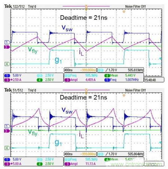 同理對于Q2開啟時,如果電感電流為正,那么當我們首先關閉Q1管時,Vsw就會被電感電流拉低到0,因為iL》0, Q2的Coss會discharged到0,然后我們再開啟Q2,就可以達到ZVS了。這里我有一張其他Topology的PWM converter的波形圖,也和buck工作原理類似,大概可以看看基本原理,也就是電感電流為負時,Q1可以實現ZVS,讓Vsw的ringing比較小。而當電感電流為正時,實現不了ZVS,Vsw的ringing就比較大了。