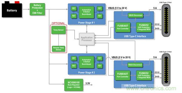 安森美半導體的FUSB302B是完全符合AEC-Q100車規的可編程的USB Type-C控制器,含電源傳輸,集成了一個BMC客戶端配置通道,支持全Type-C PD 2.0 的1.1版本。這意味著CC可用于檢測設備何時連接或未連接、主機或設備的當前功能,以及是否存在有源電纜,以及選擇所需的模式(如音頻適配器或調試附件模式)。圖1顯示了一個典型應用的框圖。