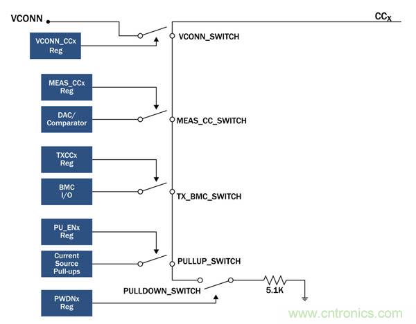 FUSB302B實施了一個CC開關,使它能夠檢測到它是作為設備主機還是雙角色端口連接,通過多個比較器和由主機處理器上的軟件控制的可編程DAC進行管理(圖3)。