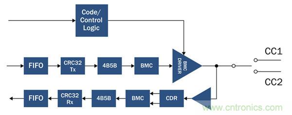 Type-C連接可正反逆插,為用戶帶來了更多的便利,卻使開發更復雜。方向通過新的配置通道(CC)管理,該配置通道在連接器上有兩個專用的引腳,并支持連接的設備協商需要提供或汲取多少電源。該通道使用的協議是一種稱為雙相符號編碼(BMC)的差分曼徹斯特編碼。USB Implementer Forum(USB-IF)定義了五個供電配置文件:10W、18W、36W、60W和100 W。使用BMC協議,電源配置文件可在含USB Type-C接口的兩臺設備之間進行交換。編碼方案使用轉換來表示邏輯電平,而不是絕對電平,并且它結合了自己的時鐘信號,使得同步更簡單。然而,BMC協議依賴于一個物理接口,該接口能在具電氣挑戰的環境中可靠地解碼信號,而且很少有電氣環境比車輛環境更具挑戰性。