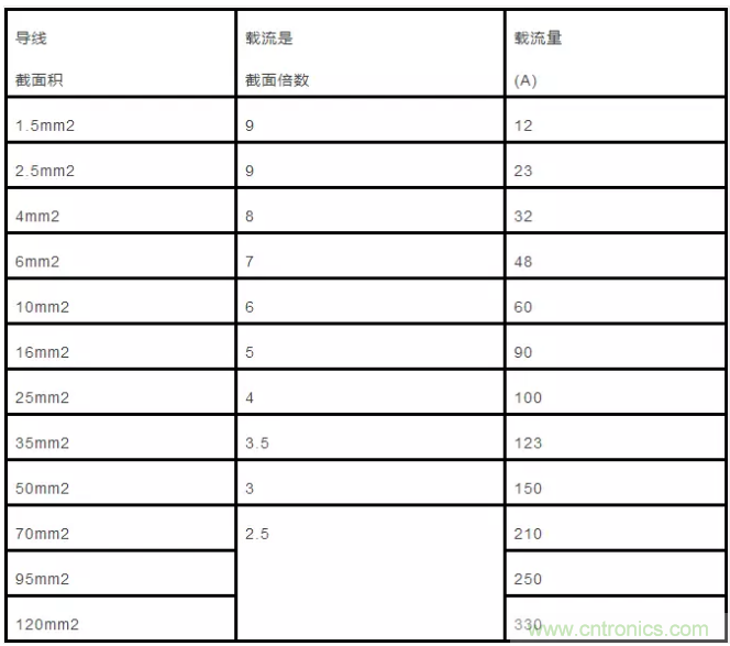 導(dǎo)線的截面積所能正常通過的電流可根據(jù)其所需要導(dǎo)通的電流總數(shù)進(jìn)行選擇,一般可按照如下順口溜進(jìn)行確定: