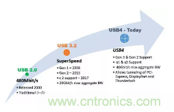畢竟USB4是下一代USB數(shù)據(jù)規(guī)范,增加了接口帶寬并支持其他協(xié)議共享物理接口。共享USB接口的最大協(xié)議是英特爾的Thunderbolt。自2000年以來(lái),USB-IF一直在系統(tǒng)地提高接口的吞吐量,以滿足客戶不斷增長(zhǎng)的數(shù)據(jù)需求。從2000年的USB 2.0開始,到2013年的USB3.2,USB數(shù)據(jù)速率已從480Mbps擴(kuò)展到20Gbps。USB4將進(jìn)一步提高數(shù)據(jù)速率到40Gbps吞吐量。