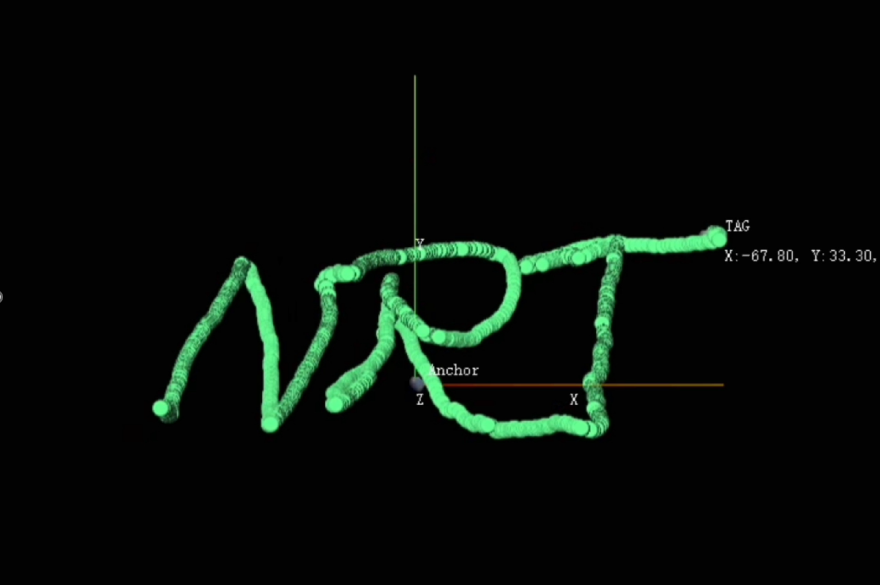 單點(diǎn)測角的誤差方差從1度縮小到0.5度左右,同時實(shí)現(xiàn)全空間測角和定位。實(shí)驗(yàn)中可以通過位移精確的寫出文字,如下圖。