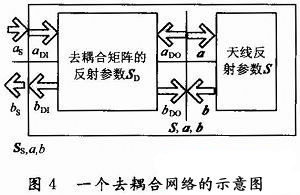 為了使正交模式的輻射效率最大,文獻和文獻詳細論述了等效耦合參數的方法。對于一個雙天線系統,等效去耦合網絡如圖4所示,其中S是天線的反射參數,SD是去耦合網絡的反射參數,文獻指出加入了去耦合系統的S參數可以表示為: