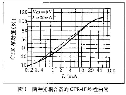 采用一只光敏三極管的光耦合器,CTR的范圍大多為20%~300%(如4N35),而PC817則為80%~160%,達林頓型光耦合器(如4N30)可達100%~5000%。這表明欲獲得同樣的輸出電流,后者只需較小的輸入電流。因此,CTR參數與晶體管的hFE有某種相似之處。線性光耦合器與普通光耦合器典型的CTR-IF特性曲線,分別如圖1中的虛線和實線所示。
