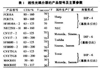線性光耦合器的典型產品及主要參數見表1,這些光耦均以光敏三極管作為接收管。