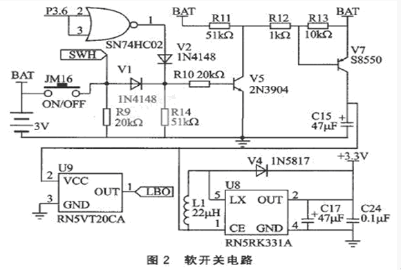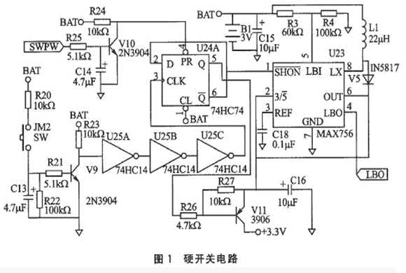 硬開關電路是將2節7號電池的串聯電壓通過DC/DC轉換器MAX756轉換成3.3 V的電壓,電路圖如圖1所示。如果不經升壓電路而直接由電池供電,那么因電池端產生的電壓存在一個由高到低的下降過程。2節新電池的串聯電壓在3 V以上,隨著能量的耗盡,會下降到2V以下,導致機器無法正常工作。JM2按鍵為開/關機鍵,在按動JM2時,由于按鍵的抖動,會產生誤動作。由R20, C13, R21,R22, R23, V9構成的充放電回路,作用是通過適當地選擇R20,C13,R21的值,使充放電回路的充電時間與放電時間都大于鍵抖動時間,從而有效地消除鍵的抖動。V9集電極輸出的按鍵脈沖經去抖后,再通過U25 (74HC14)三個帶施密特觸發器的反相器進一步濾波整形,產生波形完整的單脈沖。由該脈沖觸發U24A(74HC74 D觸發器)的翻轉。