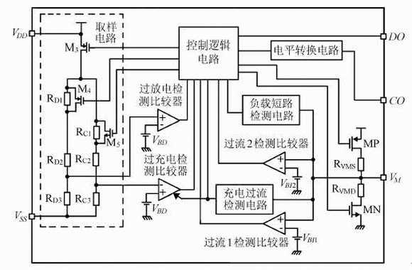 鋰離子電池保護芯片的基本功能是進行過充電保護、過放電保護和過電流保護,其中過電流保護包括充電過流保護和放電過流保護。下面以保護電路的基本功能為出發點,分析其系統的組成。