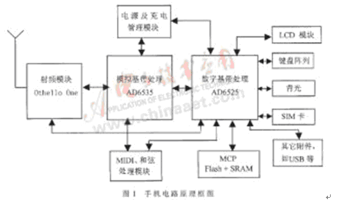 數字移動電話的電路由射頻與基帶兩大部分組成。其中射頻(RF)電路包括收發器、頻率合成器和功放等,基帶(Baseband)電路包括數字信息處理和控制器、存儲器、電源管理和其他外設部分。以ADI手機為例,其原理框圖如圖1所示。