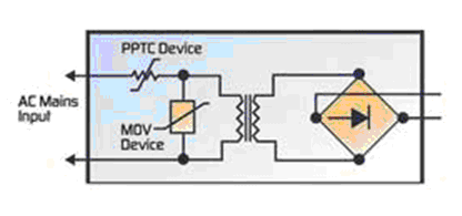 交流電源出現的一些過載狀況可能會導致壓敏變阻器仍然處在鉗位狀態,這時電流會繼續流過,最終可能會導致這個器件因過熱而損壞。把PPTC器件裝在金屬氧化物壓敏變阻器附近,就可以密切地監控壓敏變阻器的發熱狀況。在壓敏變阻器長時間過載的情況下,它的熱量會傳送到PPTC器件上,使PPTC器件更快地轉變為高阻狀態,限制壓敏變阻器中的電流,從而保護壓敏變阻器不致燒壞。
