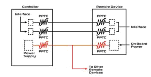 除了控制器,任何遠程傳感器、指示器,或者需要電源的制動器、模擬電路,或者通信總線接口,如果使用PPTC器件,都會給它們帶來益處(見圖3)。這些元件經常會因為接錯線路、接錯電源或者中線連接不牢固而造成損壞。