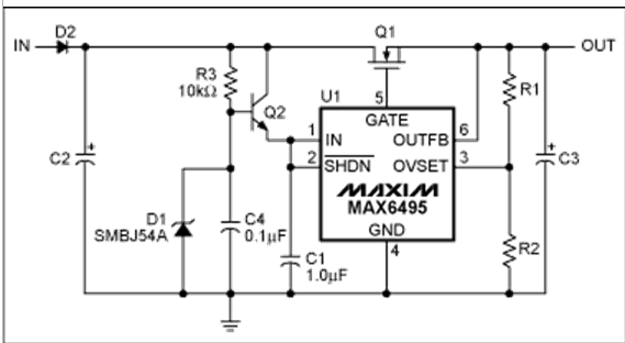 過壓保護(OVP)器件數據資料中提供的典型電路可以滿足大多數應用的需求(圖1)。然而,有些應用需要對基本電路進行適當修改。本文討論了兩種類似應用:增大電路的最大輸入電壓,在過壓情況發生時利用輸出電容存儲能量。