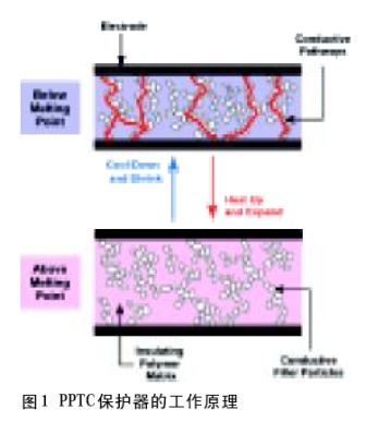 保護(hù)繼電器的一個(gè)常用元件是高分子聚合物正溫度系數(shù)(PPTC)自復(fù)過流保護(hù)器(見圖1)。 它是用碳黑這種導(dǎo)電性填料做成的。在這個(gè)元件中碳黑構(gòu)成網(wǎng)狀導(dǎo)電通路。在正常的情況下,PPTC保護(hù)器呈現(xiàn)低電阻,但是,在PPTC保護(hù)器中流過的電流過大時(shí),它的溫度升高,結(jié)晶狀聚合物變成非結(jié)晶狀態(tài)。這個(gè)轉(zhuǎn)變引起聚合物膨脹,使得導(dǎo)電性聚合物內(nèi)的網(wǎng)狀導(dǎo)電通路斷開。這個(gè)變化引起它的電阻急劇上升。由于電阻增大,于是保護(hù)器中流過的電流便下降到很小。PPTC保護(hù)器保持這個(gè)狀態(tài),直到故障被排除。一旦把故障排除了,保護(hù)器的溫度下降,碳黑形成的導(dǎo)電通路恢復(fù),它又回到低電阻狀態(tài)??梢圆皇褂肞PTC 保護(hù)器而用傳統(tǒng)的熔斷器來保護(hù)繼電器。不過,在使用熔斷器的情況下,每當(dāng)發(fā)生故障,就需要更換熔斷器。PPTC保護(hù)器的主要優(yōu)點(diǎn)在于它具有自復(fù)功能,從而可以減少昂貴的服務(wù)費(fèi)用和保修費(fèi)用。