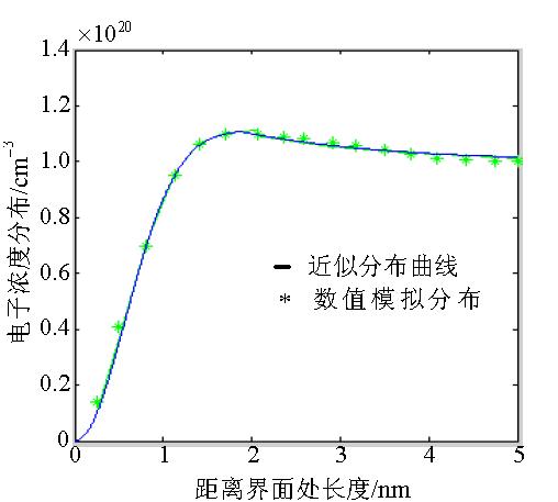 圖2給出了摻雜濃度為1020 cm−3,對應柵壓為閾值電壓時的近似曲線與數值模擬分布曲線的對比,發現近似曲線和模擬分布曲線在所研究的區間上能很好地符合,說明近似方法具有很好的準確性。另外根據量子計算,電子分布的峰值可用電子的第一個波函數的第一個峰值處近似計算: