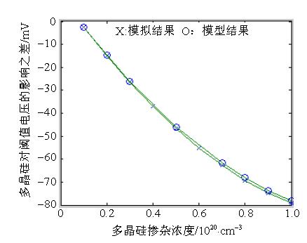 圖4給出了不同的多晶硅摻雜下,考慮多晶硅量子效應相對于只考慮體硅量子效應時MOSFET閾值電壓偏移的數值模擬結果與本文的模型結果。圖中體硅摻雜濃度為 ,二氧化硅層厚度為3 nm,可以看到隨著多晶硅摻雜濃度的增加,多晶硅量子效應對MOSFET閾值電壓的影響增大,而且變化很快,在摻雜低時候基本可以忽略,而在多晶硅摻雜濃度高時則不能忽略。但在小尺寸MOSFET中,多晶硅摻雜都很高,通常在