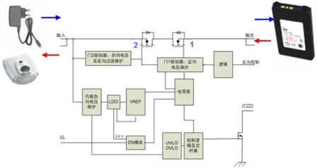 我們把普通墻式適配器或USB充電適配器到移動設(shè)備電池的通道稱為直接充電通道,而把移動設(shè)備電池到外部附件(如調(diào)頻收發(fā)器、負載揚聲器和閃光模塊)的通道稱為反向供電/充電通道(參見圖1移動設(shè)備的直接充電通道和反向供電/充電通道示意圖)。