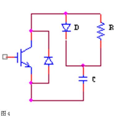 為了使IGBT關斷過電壓能得到有效的抑制并減少關斷損耗,需要給IGBT主電路設置關斷緩沖吸收電路。IGBT的關斷緩沖吸收電路分為充放電型和放電阻止型,從吸收過電壓的能力上來說,充放電型效果較好,所以可在弧焊逆變電源中的IGBT過壓保護緩沖電路可采用圖4所示緩沖吸收電路: