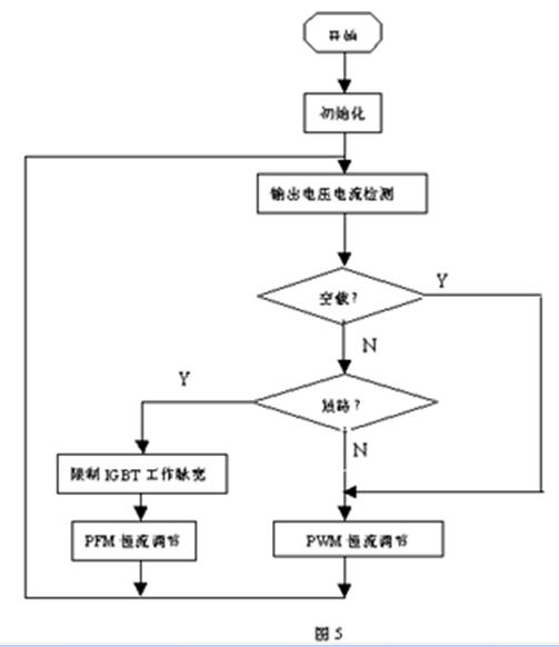同時為保證輸出電流恒定,單片機在判斷輸出為短路時將逆變器的等脈沖寬度調節(PWM)變為頻率調節控制(PFM),即脈沖分頻控制,輸出電壓越低,輸出脈沖的頻率越低。其單片機程序過程如圖5所示: