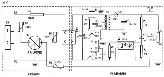 為了實現(xiàn)上述目的所采取的設(shè)計方案是:將壓敏電阻和陶瓷氣體放電管的單相并聯(lián)式抗雷擊浪涌電路應(yīng)用到儀表的電源上。主要分為防雷電路部分和開關(guān)電源電路部分,電路簡單,采用復(fù)合式對稱電路,共模、差摸全保護,可以不分L、N端連接。使壓敏電阻RV1位于貼片整流模塊前端分別與電源L、N并聯(lián),主要來鉗位L、N線間電壓,壓敏電阻RV0、RV2與陶瓷氣體放電管FD1串聯(lián)后接地,RV0與FD1串聯(lián)主要是泄放L線上感應(yīng)雷擊浪涌電流,RV2與FD1串聯(lián)主要是泄放由信號口串人24V參考電位上的能量,RV0、RV2短路失效后,F(xiàn)D1可將其與電源電路分離,不會導(dǎo)致失火現(xiàn)象。