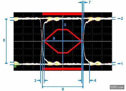 通過在示波器的垂直軸對數字信號進行反復采樣、同時采用相應數據率對水平時間掃描進行觸發來生成眼圖。所獲得的圖形看上去象眼睛,如圖1所示。“眼睛”越大,數據完整性越高。通常采用模板(mask)來對可接受的信號質量進行定義。這模板由“眼睛”中間的六角形和“眼睛”上、下的矩陣組成。如果測得的信號跡線穿越模板的邊線,那么信號質量就不可接受。USB2.0信號模板規范由USB應用者論壇(USBIF,www.usb.org)提供,可參見USB2.0版規范第7.1.2.2章節。圖1中顯示了帶有詳細臨界點的眼圖。