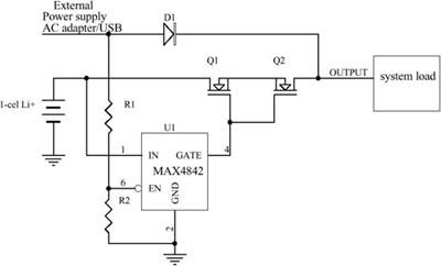 另外,MAX4842的過壓保護(hù)門限為4.4V-5.0V,也高于單節(jié)鋰電的4.2V上限電壓。電源切換電路是利用MAX4842的使能控制引腳/EN配合分壓電阻R1/R2實(shí)現(xiàn)的。當(dāng)沒有外部電源接入時(shí),如果電池電壓高于2.8V-3.2V的保護(hù)門限,/EN被R2拉低,MAX4842驅(qū)動(dòng)Q1、Q2的柵極為高電平使其導(dǎo)通,電池為負(fù)載供電;當(dāng)有外部電源接入時(shí),通過R1/R2分壓后在/EN引腳上產(chǎn)生的電壓高于1.47V后MAX4842被禁止,Q1、Q2被關(guān)閉,由外部電源給負(fù)載供電。圖中的二極管D2用于阻斷灌入外部電源的反向電流,并防止/EN被錯(cuò)誤拉高。由于它串在外部供電通路上,損失一點(diǎn)效率沒有關(guān)系。