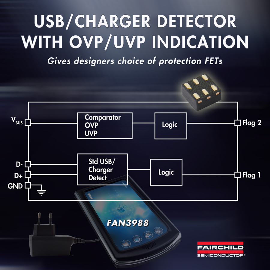 飛兆半導(dǎo)體公司(Farichild Semiconductor) 為手機(jī)和手持移動(dòng)產(chǎn)品設(shè)計(jì)人員提供一款帶有高集成度過(guò)電壓保護(hù)(OVP)和USB/充電器檢測(cè)功能的器件FAN3988。該器件是飛兆半導(dǎo)體OVP產(chǎn)品系列的最新成員,可讓終端用戶按照應(yīng)用所需之特定導(dǎo)通電阻和電流能力,靈活選擇外部P溝道MOSFET。