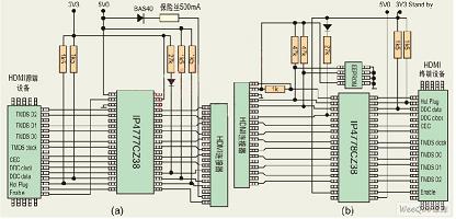 上面兩個圖分別給出了HDMI源設(shè)備的高集成度解決方案和HDMI終端設(shè)備的高集成度解決方案的電路示意圖。