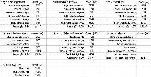 關(guān)于該表要注意的最后一點(diǎn)是:如果考慮車身電子、照明和底盤電子等子系統(tǒng)的間歇性負(fù)載,對(duì)汽車充電系統(tǒng)的需求就真的是附件超載(accessoryoverload)。將來的系統(tǒng)將持續(xù)這種趨勢(shì)。