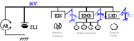 在這個(gè)高度簡(jiǎn)化的描述中,超級(jí)電容分布模塊或雙層電容(DLC)緊靠高耗能用電負(fù)載,如EPS(1.2KW)、電子機(jī)械剎車(1到2KW)和新型照明系統(tǒng)(如最近出現(xiàn)的白光LED頭燈)。本地分布式模塊為高峰負(fù)載供電,避免造成來自交流發(fā)電機(jī)和電池的14V電源線出現(xiàn)強(qiáng)烈的波動(dòng)。