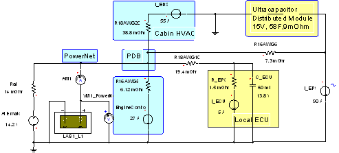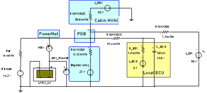 在上圖中,汽車充電系統(tǒng)由交流發(fā)電機(jī)和鉛酸電池來表示。在這種情況下,要利用Ansoft公司的汽車工具箱之中的Simplorer電化學(xué)建模工具對(duì)電池進(jìn)行比較詳細(xì)的建模。PowerNet被高度簡(jiǎn)化為由線規(guī)電阻建模的四個(gè)分支電路,包括引擎控制、車箱氣候控制、本地ECU和EPS(最右邊)。PowerNet分配點(diǎn)被標(biāo)注為PDB或電力分配箱。