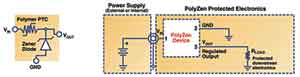 新一代增強聚合物齊納二極管也可以保護敏感的電子器件免于被感應電壓尖峰、瞬態過壓、不正確的供電和極性接反等所損壞。如圖1所示,PolyZen器件包括一個用于電壓鉗位的穩壓齊納二極管和一個非線性PPTC薄膜器件。