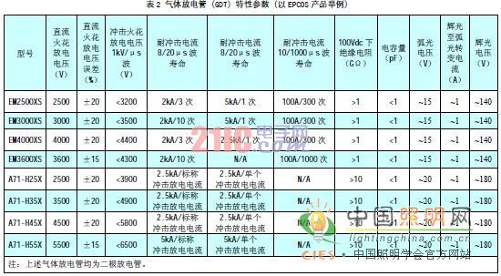 為了使LED路燈能夠滿足安全要求,氣體放電管的耐壓選擇至關(guān)重要,應(yīng)該選取足夠耐壓的氣體放電管與壓敏電阻配套,壓敏電阻和氣體放電管串聯(lián)電路(如圖1)應(yīng)能夠承受基本絕緣的耐壓。幾種氣體放電管的直流火花放電電壓和交流擊穿電壓的關(guān)系見表3,氣體放電管的直流火花放電電壓一般應(yīng)選不低于2500V。