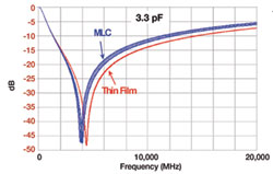 薄膜電容器(如圖1所示)還具有一項前面沒有提及的性能優勢:它的響應只有1個諧振點,因為這種器件使用單絕緣層設計封裝成多層陶瓷電容器(MLCC)。圖2顯示了這種薄膜電容器的部分S21前向傳輸損耗特性曲線。
