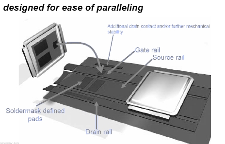 除了裸芯片,IR亦將提供專有的芯片載體解決方案。該方案附有正面金屬可焊IGBT,來支持那些生產線沒有能力處理裸芯片的客戶。最先進的高性能IGBT是以非常纖薄的晶圓制造,厚度僅為60到70微米。這些硅晶圓既薄且具彈性,就如紙張一樣,所以必須使用極為專業的程序和昂貴的器材去處理。很多第一級和第二級的系統供應商都不愿意投資這種昂貴的器材,也不想經歷需要長久學習才會熟練的纖薄芯片處理過程,更不希望要承受薄芯片處理期間非常高的良率耗損。