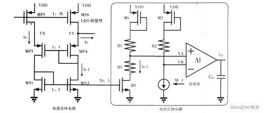 如圖1所示,電流采樣電路包括MP5、MP4、MP3、MN2和MN1。因為MP5和MP6均工作在飽和區(qū),為了使MP5更好地等比例鏡像LDO的調(diào)整管(PMOS驅(qū)動管)MP6的電流,特使用MN1、MN2、MP3和MP4組成自偏置的鏡像陣列,以保證VX=VY,Vds_p5=Vds_p6。所以根據(jù)飽和區(qū)電流公式得到,N1I_p5=N1Is=N1Is1=I_p6。為使M3電流與Is更好的匹配,根據(jù)經(jīng)驗值并考慮功耗因素,特意將MN1、MN2和M3的過飽和電壓提高到0.3V。