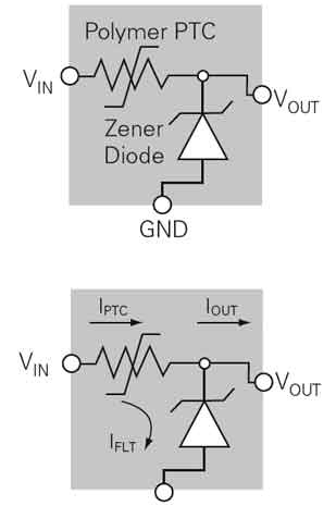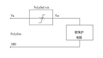 在正常工作時,VIN輸入電壓高于齊納二極管的擊穿電壓VZ,有IFLT電流經齊納二極管到地,VOUT輸出穩定的電壓。有不正常的過壓輸入VIN 時,則齊納二極管的IFLT會產生過流,當器件上有過流時,其電阻由低阻態瞬變到高阻態,使在其上的壓降大增,VOUT輸出基本不變,而流過齊納二極管的 電流IFLT反而減小,如下圖所示。器件上電壓降的增大既保護了齊納二極管,又保護了下游的電路。另外,若被保護的下游電路中存在有局部短路或短路故障 時,IOUT會增加,PPTC元件由低阻態變成高阻態,可使電路得到過流保護。