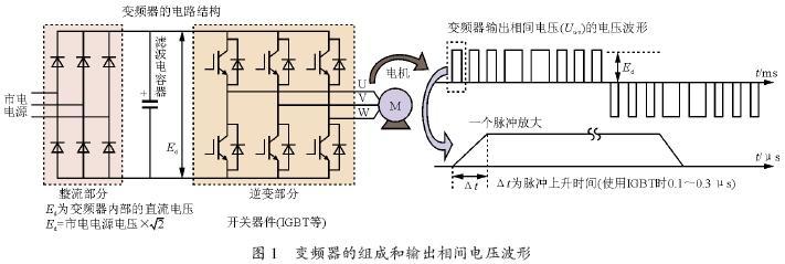 變頻器主要由把交流市電整流成直流的整流器、平滑電壓脈動的電容器、6 個開關器件構成的逆變器所組成。如圖1 所示,逆變器部分輸出由改變脈沖寬度(PWM 波)形成的等效正弦波交流電壓去驅動電機。近幾年的變頻器為了使電機低噪音化,逆變部分的開關器件采用IGBT進行著高速開關動作。因此,在PWM 波的每個脈沖上升和下降時,即開關時間以非常短的時間駐t=0.1~0.3 滋s切換著的時候,使逆變器內部的直流電壓Ed(400 V電力系統用逆變器的Ed=600 V左右)因切換所形成的電壓變化率dv/dt變得很大,這是產生微浪涌的主要根源之一。