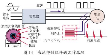 浪涌抑制組件的工作原理如圖14 所示。浪涌抑制組件內部卷繞的浪涌抑制線具有和電纜線的阻抗ZL相同的阻抗,因此接到電機的接線端子上降低了電機接線端子的阻抗,從而減少了阻抗不匹配時的反射波。通常高頻波成分在電纜線上的阻抗ZL是50耀100 贅,設計的浪涌抑制線的阻抗ZS是50~60歐。