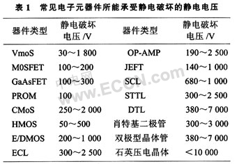 (2)靜電釋放(ESD)破壞,造成電子元件不能工作。表1列出了一些常見電子元器件所能承受靜電破壞的靜電電壓,從表中可以看出大部分器件的靜電破壞電壓都在幾百至幾千伏,而在干燥的環(huán)境中人活動所產(chǎn)生的靜電可達幾千伏到幾萬伏。圖2是一個CMOS器件和一個雙極型器件在受到ESD損傷后芯片內(nèi)部的相貌像;
