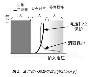 電壓箝位與消弧:電壓箝位器件的工作原理是從低電壓時(shí)的高阻抗轉(zhuǎn)換至高于導(dǎo)通電壓時(shí)的低阻抗,且沒(méi)有負(fù)阻抗區(qū)域(圖2)。這器件通過(guò)提供接地的低阻抗通道,對(duì)高于導(dǎo)通電壓的電壓進(jìn)行箝位。消弧(crowbar)器件在低電壓時(shí)也呈高阻抗,但當(dāng)電壓較高時(shí)觸發(fā)新的導(dǎo)通機(jī)制,使電流增大,并伴隨著電壓下降。因此,消弧器件擁有負(fù)阻抗區(qū)域。某些消弧器件的觸發(fā)電壓可能非常高。如果消弧TVS觸發(fā)器的速度足夠快,就可以經(jīng)常提供保護(hù),即便電壓已經(jīng)達(dá)到可能導(dǎo)致器件損壞的電平。消弧器件有時(shí)也稱(chēng)作“驟回”器件,因?yàn)殡妷后E然下降。