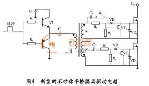 根據(jù)以上幾種驅(qū)動電路,針對傳統(tǒng)隔離驅(qū)動電路結(jié)構(gòu)復(fù)雜、占用空間大和不對稱半橋?qū)S眯酒?qū)動電路應(yīng)用的局限性等問題,提出了一種新型的不對稱半橋隔離驅(qū)動電路,適用于單脈沖輸出的芯片,具有結(jié)構(gòu)簡單可靠,占用空間小等特點,并且實現(xiàn)了電氣隔離,可以運用于中大功率場合。