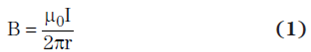 其中,B 為以第平方米伏秒 (V•s/m2) 表示的磁通密度,μ0 為自由空間中的磁導率(計算方法為 4π × 10–7 V•s/A•m),I 為以安培為單位的電流,r 為以米為單位的導體距離,而 H 為以安培每米 (A/m) 為單位的磁場強度。