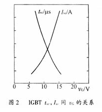 IGBT的短路電流和柵壓有密切關系,柵壓越高,短路時電流就越大。在短路或瞬態過流情況下若能在瞬間將vGS分步減少或斜坡減少,這樣短路電流便會減小下來,當IGBT關斷時,di/dt也減小。集成驅動電路如EXB841或M579xx系列都有檢測vCES電路,當發現欠飽和時,柵壓箝位到10V左右,增大vCES,限制過電流幅值,延長允許過流時間。短路允許時間tsc和短路電流Isc同柵極電壓vG的關系如圖2所示。
