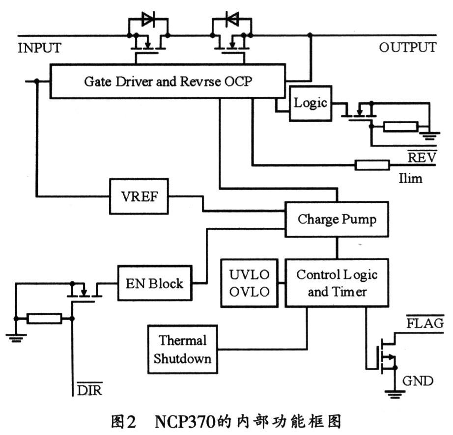 將外設連到IN端,NCP370便可進入反向模式。此時,外設內部的電池可由NCP370的OUT端來供電。在反向模式下,NCP370的REV端必須置低,這樣,當外設發生過壓、欠壓或過流等故障時,NCP370內部的過壓、欠壓或過流保護電路才會起作用,同時其FLAG也才會向系統發出報警信號。圖2所示是NCP370的內部功能框圖。