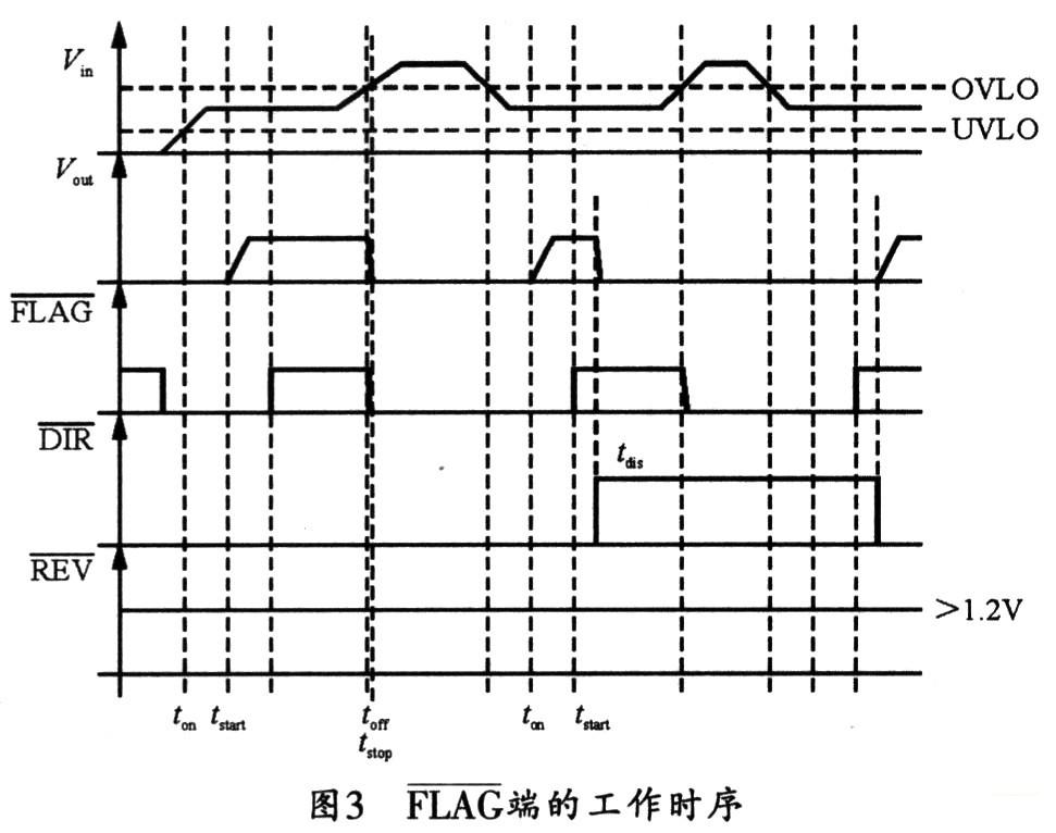 NCP370內含一個FLAG報警提示引腳。一旦NCP370檢測到輸入電壓高于OVLO閥值、低于U-VLO閥值或過流、過壓等故障,FLAG端就會置低,并通知微控制器采取適當的措施。而當輸入電壓恢復到正常范圍時,FIAG又會在經過一個延遲后置高,隨后使Vout恢復輸出,其工作時序如圖3所示。