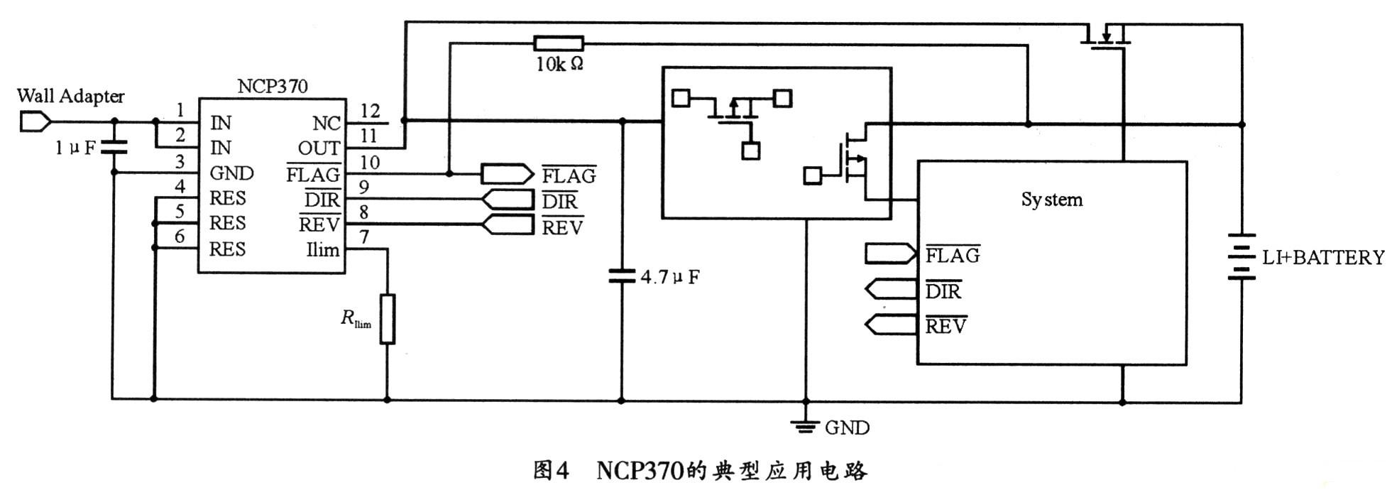DIR:正向模式輸入端,需與REV結合起來使用。當墻上適配器AC-DC連接到IN端時,NCP370內部的N溝道MOS管開啟,電路進入正向模式。而當該端和REV均為高時,NCP370進入關斷模式,此時,輸出將與輸入斷開。但DIR端的狀態不會影響到FLAG的故障檢測。