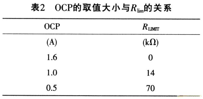 當外設電阻Rlim上的電流(Ilim)高于Iocp時,流過其內部N溝道MOS管的電流就會受到限制,這樣,NCP370就能提供從電池到外設的反向過流保護功能。由于NCP370的內部電阻與Ilim是串聯關系,因此,當Ilim引腳直接與GND相連時,其OCP最大,而在它們之間接入Rlim時,其OCP會減小,OCP的取值大小如表2所列。當電流高于OCP時,其內部的NMOS會關斷,且/FIAG會置低,同時NCP370會通知微控制器來對故障進行處理,并禁止反向充電模式。