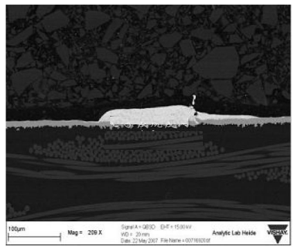 厚膜電阻的使用經(jīng)驗表明,短時過載、焊接熱等熱應力和脈沖應力會使阻值發(fā)生漂移。這些在貼片式保險絲里發(fā)生的現(xiàn)象將會改變保險絲的特性,進而縮短熔斷時間。雖然熔體使用了幾種不同的材料,例如銅錫合金,可以達到高水平的I2T,但在持續(xù)的熱應力之后,熔體對斷開時間的縮短是非常敏感的。這是由于應力會導致熔體組成材料的遷移,如圖2所示,該圖顯示了在施加脈沖負載應力之后,銅錫合金正在發(fā)生遷移的情況。